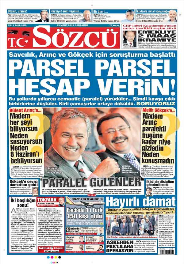 Gökçek'in "Ankara'yı parsel parsel sattı. Paralelin kucağına oturdu. 7 Haziran'daki seçimden sonra her şeyi açıklayacağım" dedi... Vatandaş Arınç'a; "Partini değil, ülkeyi düşün. Şimdi konuş ki yargı hesap sorsun" diyor.