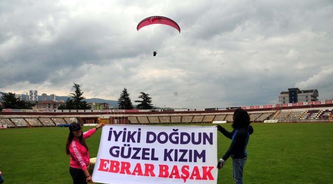 TOKAT'ta düzenlenen Havacılık Festivali'nde Gıj Gıj Tepesi'nden pilot Arif Kemal Buhara ile birlikte yamaç paraşütüyle atlayıp Gaziosmanpaşa Stadyumu'na inen 15 yaşındaki Ebrar Başak Uğur'a burada sürpriz bir doğum günü kutlaması yapıldı.