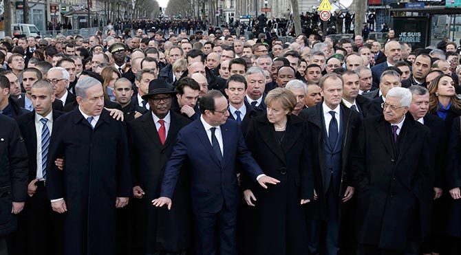 Yaşananlar üzerine, aralarında Başbakan Ahmet Davutoğlu'nun da olduğu 50'ye yakın ülkeden devlet ve hükümet başkanları Paris'te "Cumhuriyet Yürüyüşü"ne katıldı. Paris'e gelen liderler, tarihe geçecek bir dayanışma örneği sergileyerek toplu halde yürüyüşe geçti. İsrail Başbakanı Binyamin Netanyahu ve Filistin lideri Mahmud Abbas başta olmak üzere çatışma halindeki liderleri dahi bir araya getiren yürüyüş, tüm dünyada büyük yankı uyandırmıştı. Herkese örnek olacak yürüyüşte, liderler kol kola girerek kortej oluşturmuş ve yoğun güvenlik önlemleri altında yürüyüşü tamamlamıştı.