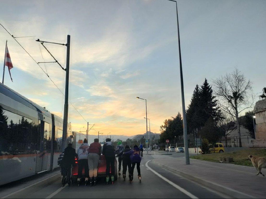 Aracın hareket etmesiyle yolculuklarına devam eden çocukların birbirlerini de tuttukları görüldü. Kırmızı ışıkta dahi aracı bırakmayan patenli çocukların dans ettiği anlarda kameralarca kaydedildi.