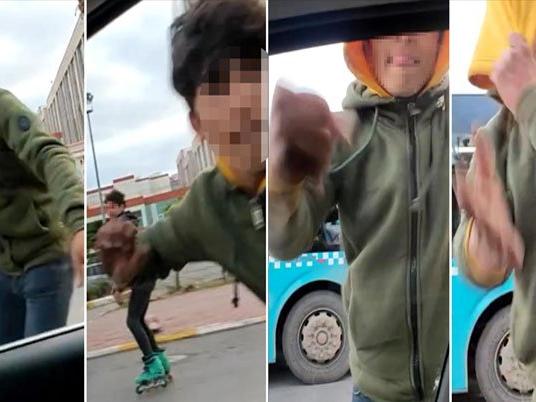 Görüntülendiklerini fark eden gençlerden biri üzerindeki kapüşonu başına geçirerek, önce sürücüye baktı, ardından cama sert bir yumruk attı. Genç, daha sonra araçların arasına girerek uzaklaştı.