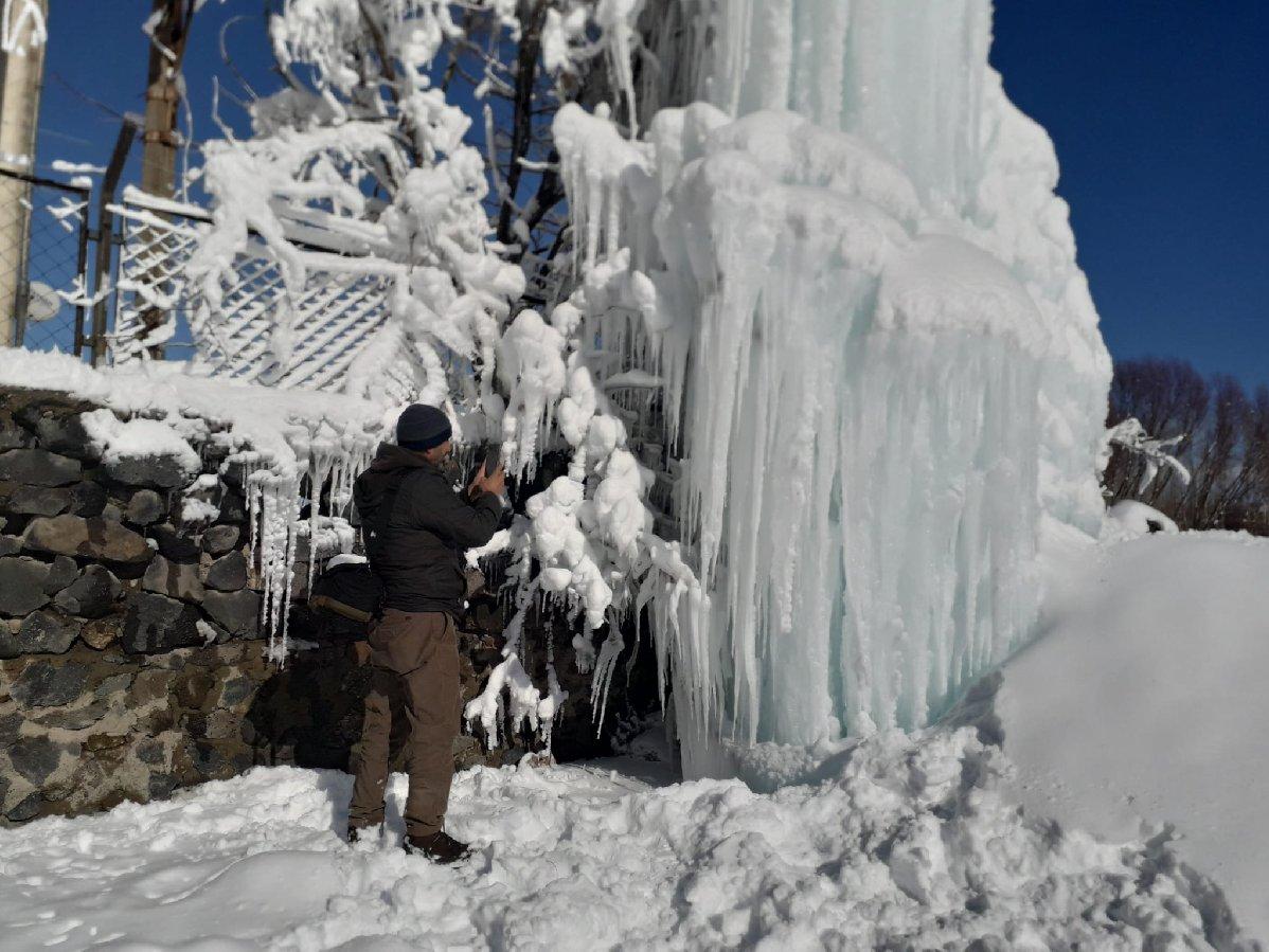 Mahalle halkından Yağmur Eşin, "Burada aslında gördüğünüz su boru hattı. Bu su boru hattı patlayarak bir şelale görüntüsü oluşturdu. Boru hattından fışkıran sular donarak buz dağını oluşturdu" dedi. (DHA)