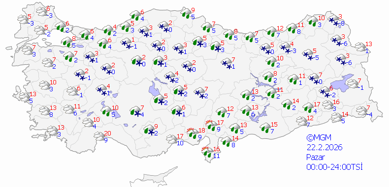 MGM, internet sitesinden yayınladığı 5 günlük hava tahmin raporu ile sıcaklıklarının birçok ilde sert düşüş yaşayacağını belirtirken, 22 Şubat pazar günü 34 ile kar yağışı uyarısında bulundu.