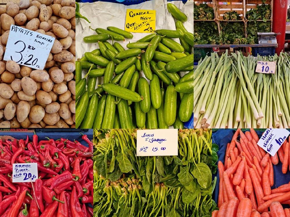 Tere bağı 10 TL, maydanoz demeti 5 TL, havuç kilosu 10 TL, dolma biber kilosu 20 TL, kırmızı biber kilosu 20 TL, çalı fasulye kilosu 30 TL, karnabaharın kilosu 10 TL, portakalın kilosu 6 TL, kırmızı elmanın kilosu da 6.5 TL.