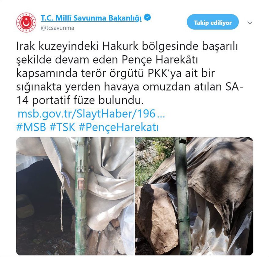 Bakanlığın Twitter hesabından yapılan açıklamada, "Irak kuzeyindeki Hakurk bölgesinde başarılı şekilde devam eden Pençe Harekâtı kapsamında, terör örgütü PKK’ya ait bir sığınakta yerden havaya, omuzdan atılan SA-14 portatif füze bulundu" denildi.