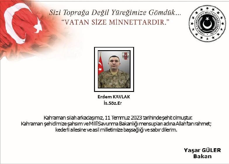Milli Savunma Bakanlığı tarafından yapılan yazılı açıklamada, "Pençe-Kilit Operasyonu bölgesinde, 11 Temmuz 2023 tarihinde meydana gelen silah kazası sonucu ağır yaralanarak hastaneye sevk edilen kahraman silah arkadaşımız Sözleşmeli Er Erdem Kavlak yapılan tüm müdahalelere rağmen kurtarılamayarak şehit olmuştur. Bizleri derin bir acı ve üzüntüye boğan bu olayda hayatını kaybeden aziz şehidimize Allah'tan rahmet, kederli ailesine, Türk Silahlı Kuvvetleri ile asil milletimize başsağlığı ve sabır dileriz" denildi.
