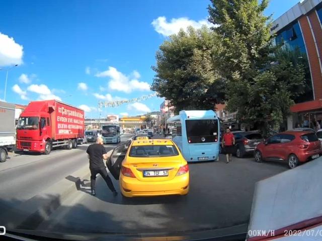 Kadına şiddet olayı trafikteki bir başka sürücünün araç kamerasına yansıdı. Görüntülerde kendisine darbeden kişiden kaçmaya çalışan kadının, taksiye bindiği görülüyor. Saldırganın arkasından taksiye gelerek kadına aracın içerisinde saldırmaya devam ediyor. Kamera kaydında çevredekilerin adama müdahale ederek, tekme tokat dövdüğü de görülüyor. (DHA)