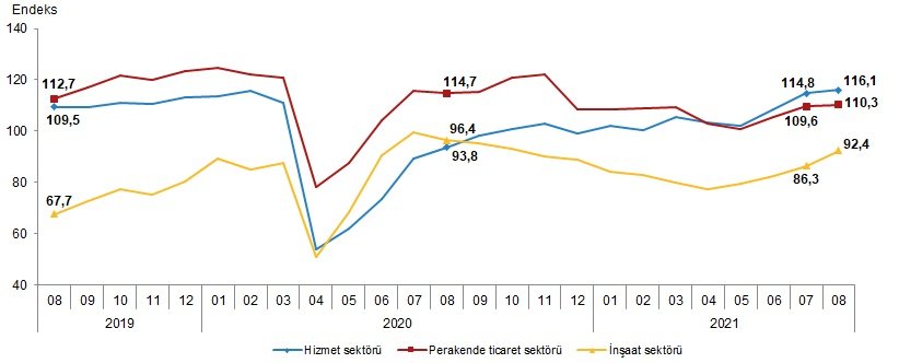 Mevsim etkilerinden arındırılmış hizmet sektörü güven endeksi Temmuz ayında 114,8 iken, Ağustos ayında yüzde 1,2 oranında artarak 116,1 değerini aldı.