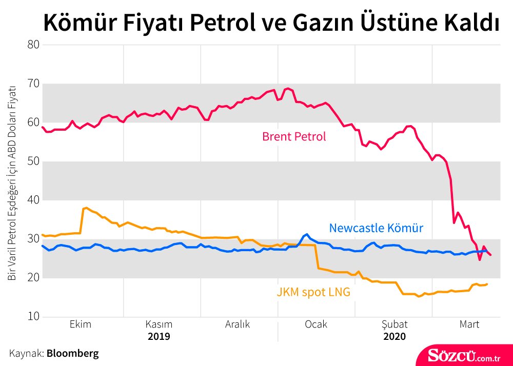 En çok işlem gören kömür sözleşmesi olan Avustralya'nın Newcastle kömüründe ton fiyatı cuma günü 66,85 dolardı. Bu rakamın petrolle eşdeğer fiyatı ise 27,36 dolara denk geliyor. Aynı gün Brent petrolün varil fiyatı ise 26,98 dolardı.