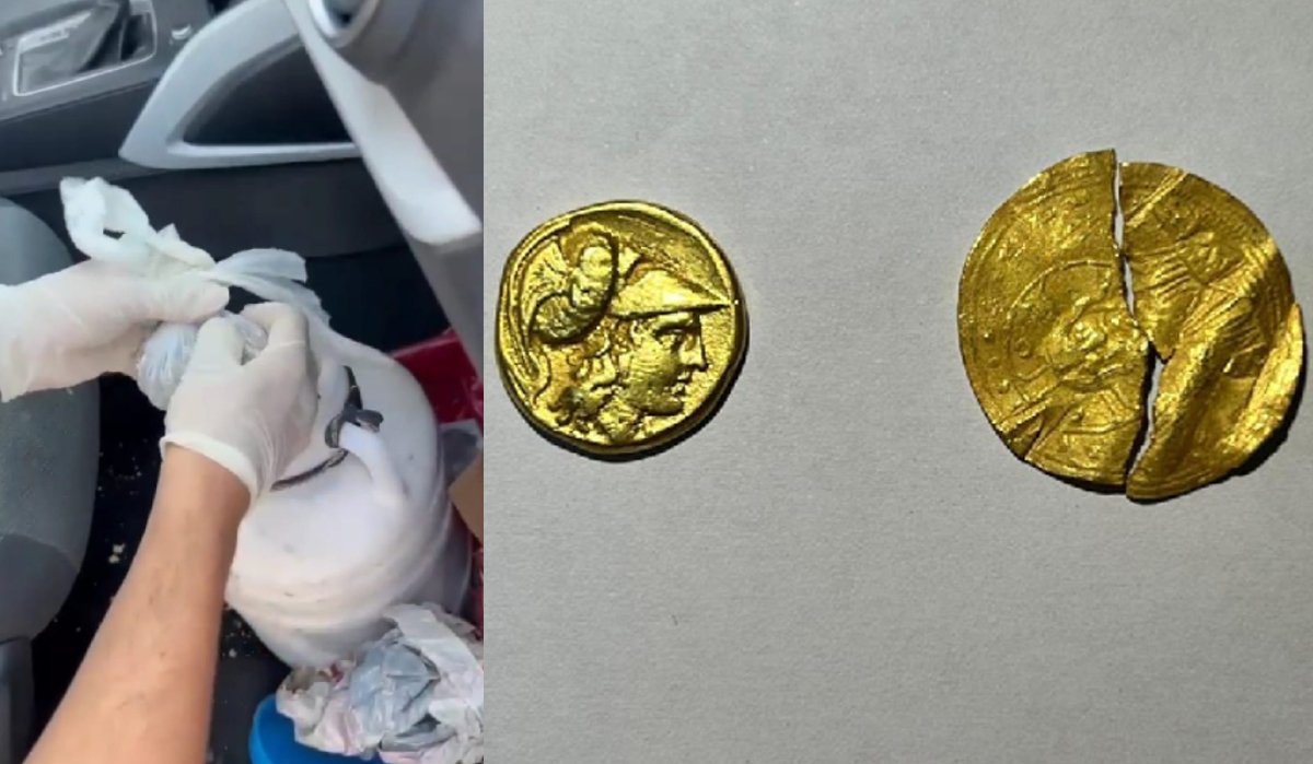 Aramada, peynir bidonu içerisinde saklanmış, tarihi eser olduğu değerlendirilen altın renginde 265 sikke, valizde ise 2 sikke ele geçirildi.