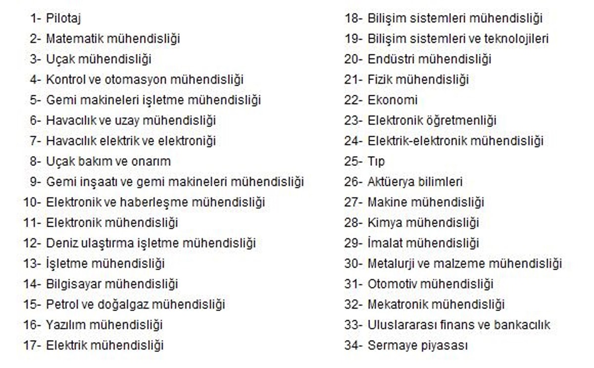 Pilotaj (363), matematik mühendisliği (227), uçak mühendisliği (564), kontrol otomasyan mühendisliği (134), gemi makineleri işletme mühendisliği (429), havacılık ve uzay mühendisliği (809), uçak bakım onarım (311), gemi inşaatı ve gemi makineleri (533), elektronik ve haberleşme (529)