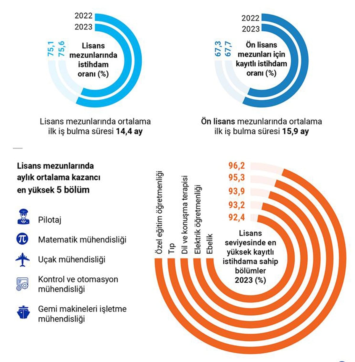 Lisansta en yüksek istihdama sahip bölümler ve yüzdelik dilimleri TÜİK’e göre özel eğitim öğretmenliği (96.2), tıp (95.3), dil ve konuşma terapisi (93.9), elektrik öğretmenliği (93.2), ebelik (92.4) oldu. En hızlı iş bulanlar ise 2.3 ay ile dil ve konuşma terapistleriyle 4.2 ay ile doktorlar ve 7.3 ay ile ebeler.