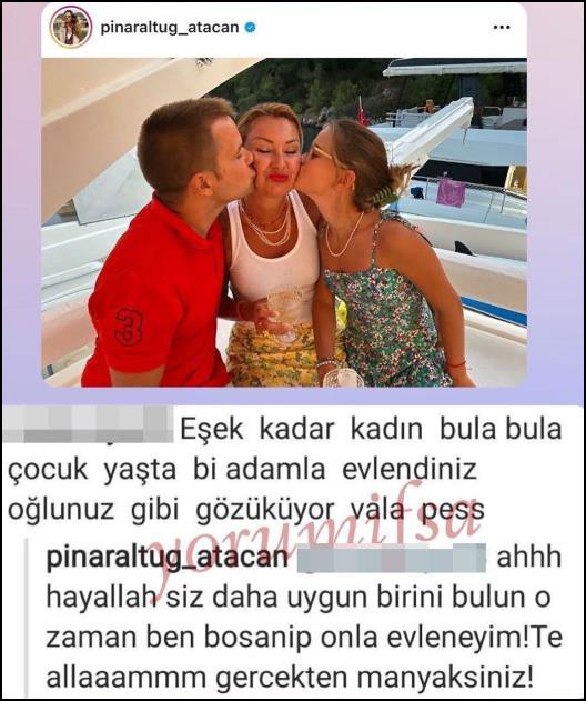 Pınar Altuğ, kendisini çirkin bulan ve "Koca karı" diyen takipçisinin yaptığı yorumların ekran alıntısını Instagram hesabından "Ben hanimefendinin derdini anlayamadım, anlayan biri varsa bana anlatabilir mi lütfen?" notuyla paylaşmıştı.