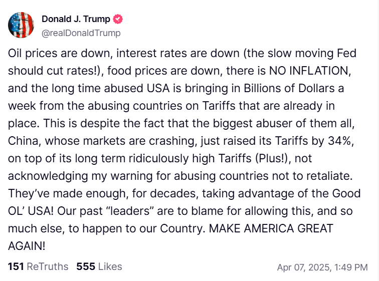 Çin’in pazarlarının çöktüğünü öne süren Trump, Pekin yönetiminin tarifeleri yüzde 34 artırarak ABD’nin uyarılarını görmezden geldiğini söyledi. “Onlarca yıl boyunca iyi niyetli ABD’den fazlasıyla kazandılar. Bu duruma göz yuman eski liderlerimizi suçluyorum” diyen Trump, açıklamasını “Amerika’yı Yeniden Büyük Yapın!” sözleriyle tamamladı.