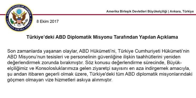 ABD Büyükelçiliği, Türkiye'den yapılan vize başvurularının süresiz olarak durdurulduğunu bildirdi. Türkiye de bu kararı ardından ABD vatandaşlarının vize başvurularını askıya aldı. ABD’nin İstanbul başkonsolosluğunda çalışan Metin Topuz adlı yerel çalışan geçen hafta devam eden bir FETÖ soruşturması kapsamında once gözaltına alınmış, ardından da çıkarıldığı mahkemede tutuklanmıştı.