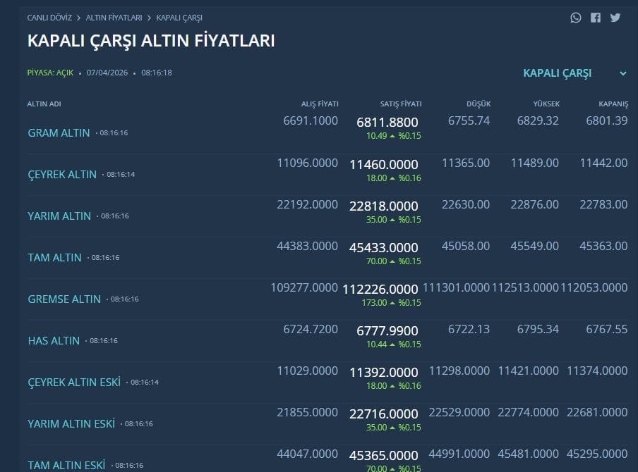 Kapalıçarşı altın fiyatları ile resmi altın fiyatları arasındaki fark devam ediyor. Kapalıçarşı'da gram altın 6 bin 811 lirada bulunuyor.
