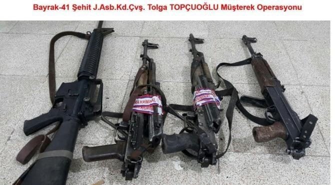 silah-2"Söz konusu operasyon kapsamında 20 Mart 2017 Pazartesi günü icra edilen temas araması faaliyeti esnasında; Lice ilçesi Şenlik Köyü Akçapınar Mezrası mülki sınırlar içerisinde 19 Mart 2017 Pazar günü 2 farklı yerde bir grup bölücü terör örgütü mensubu ve sağlanan silahlı çatışma neticesinde 6 terörist etkisiz hale getirilmiş, bölgede havanın aydınlamasıyla birlikte yapılan temas araması neticesinde sığınak civarındaki arazi kesiminde, 2 terörist daha ölü ele geçirilmiş, Lice ve Kulp ilçelerinde bölücü terör örgütü mensuplarına ait 2 ayrı sığınak içerisinde yapılan detaylı aramada; omuzdan atılan ısı güdümlü portatif alçak irtifa hava savunma sistemi olduğu değerlendirilen 1 adet (tetik tertibatı ile termal bataryası mevcut olan) SA-18 Grouse füzesi, 1 adet M-16 piyade tüfeği, 1 adet PKMS (bixi) makinalı tüfeği,2 adet kaleşnikof piyade tüfeği, 5 adet M-16 piyade tüfeği şarjörü, 2 adet kaleşnikof piyade tüfeği şarjörü, 6 adet el bombası, 396 adet muhtelif fişek, 3 adet el yapımı patlayıcı ateşlemede kullanılan basma düzenek, 8 adet Alfa Fire alıcı, 3 adet ateşleme anahtarı, 17 adet elektrikli fünye, 3 adet 8’li pil bloğu, 5 adet 4’lü pil bloğu, 1 adet Yaesu sabit telsiz, 2 adet Yaesu El Telsizi, 1 adet ses kayıt cihazı ele geçirilmiş. Cumhuriyet Savcılığı'nın talimatı gereğince tespit edilen sığınaklar kullanılamaz hale getirilerek sığınaklar içerisinde bulunan örgütsel doküman ve giyim malzemesi ile bin 220 kg muhtelif yiyecek maddesi ve çok sayıda yaşam malzemesi yerinde imha edilmiş, Cumhuriyet Savcılığı'ndan alınan adli arama kararına istinaden icra edilen adli arama faaliyetleri neticesinde bölücü terör örgütüne lojistik destek sağlayarak işbirlikçilik yaptığı gerekçesi ile 2 şahıs yakalanarak gözaltına alınmış, teröristlerce amonyum nitrat ve alüminyum tozu kullanılarak tuzaklanmış 6 adet el yapımı patlayıcı düzeneği tespit edilmesi müteakip, patlayıcı madde imha timi marifetiyle yerinde tahrip edilmiştir."