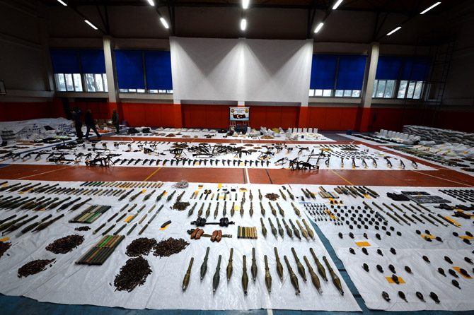 FOTO:DHA - Son olarak önceki gün Diyarbakır'ın Bağlar ilçesi Kaynartepe mahallesinde yapılan operasyonda, PKK'ya ait bir spor salonu dolusu silah ve mühimmat ele geçirilmişti.PKK'nın kullandığı hafif ve ağır makineli tüfekler arasında RPK Makineli Tüfek, PKM Makineli Tüfek (BIXI), HK-23 Makineli Tüfek, MG-3 Makineli Tüfek, DSHK-M Ağır Makineli Tüfek bulunuyor. PKK'nın kullandığı tanksavar silahları arasında ise RPG-7, RPG-16, PG-7V AT Roket, RPG-18, M-72 LAW, Katyuşa silahı yer alıyor.