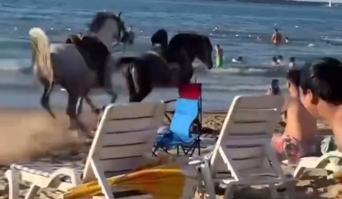 Kısa süre sonra ise atların huysuzlanarak sahiplerinin elinden kurtularak kaçtığı, deniz kenarında güneşlenen vatandaşların arasında daldığı ve vatandaşların atlardan kaçtığı anlar kameraya yansıdı.