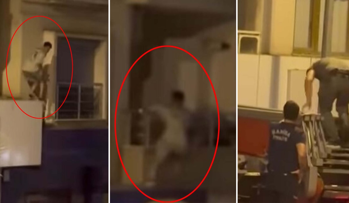 Polislerin merdiven aracıyla eve girmeye çalıştığını fark eden şüpheli, yakalanmamak için önce pencereden bitişikteki apartmanın balkonuna geçti, ardından da balkon korkuluklarına tırmanarak beş kat çıkıp çatıya ulaştı.
