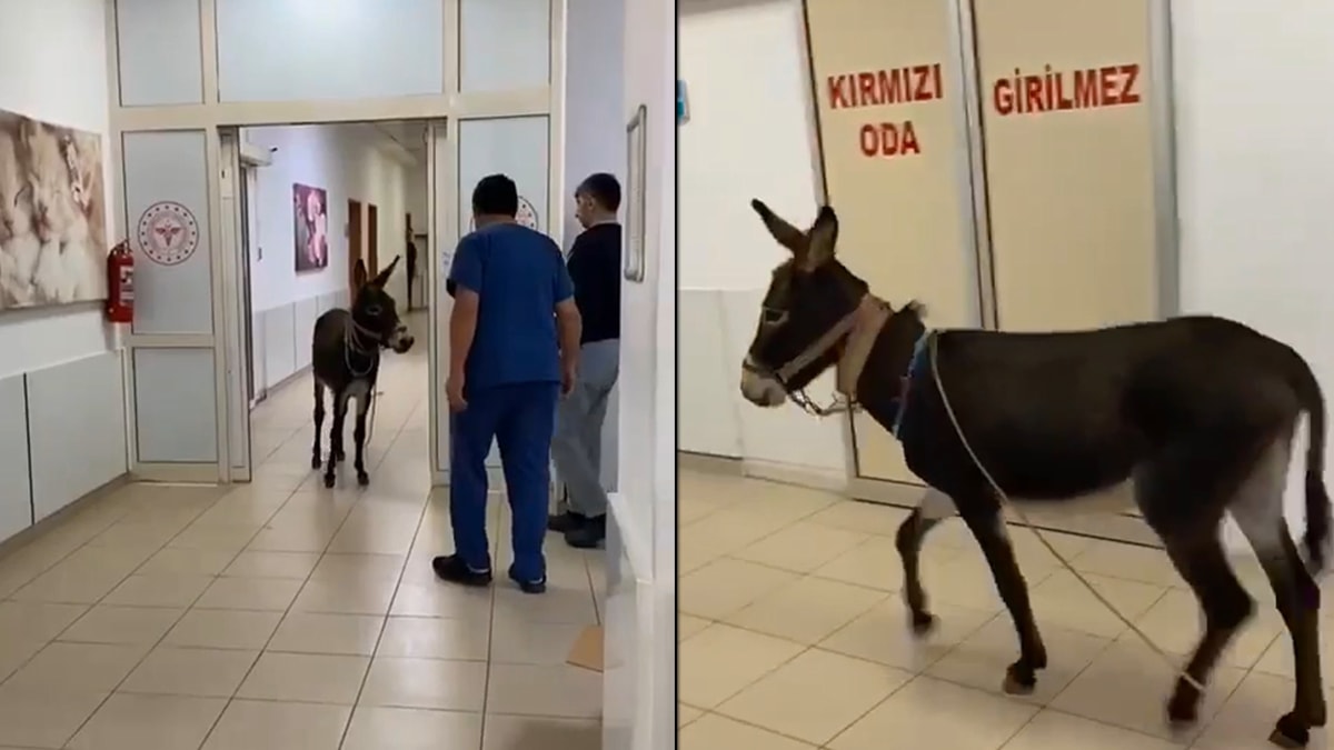 Eşek, bekçiler ve hastane görevlileri tarafından yakalandı. Eşeğin acil servisteki görüntüleri, yayınlandığı sosyal medyada ilgi gördü.
