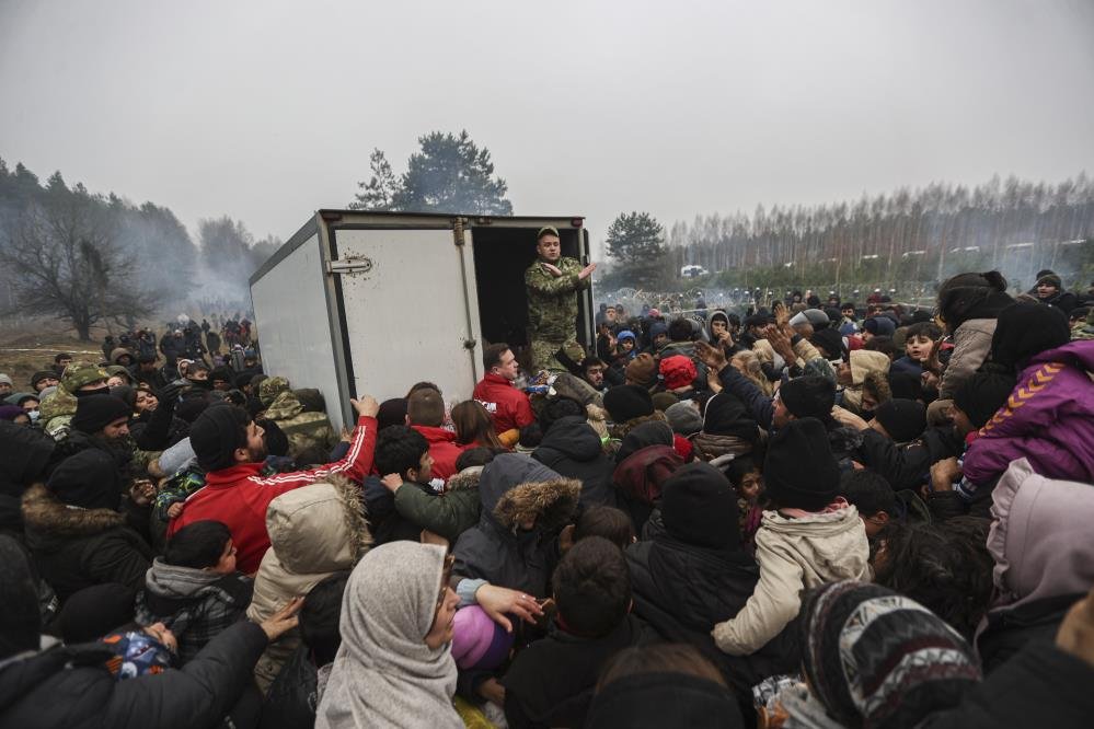 Foto: İHAPolonya sınırındaki Grodno bölgesinde yer alan Bruzgi köyüne gelerek inceleme yapan BM ve Kızılhaç görevlileri, göçmenlere gıda ve giyim yardımında bulundu. Belaruslu askerler de kamyonlarla getirdikleri ekmek ve suları göçmenlere dağıttı. Ancak yardım dağıtımı izdihama dönüştü. Göçmenler yardımları alabilmek için birbiriyle yarıştı.