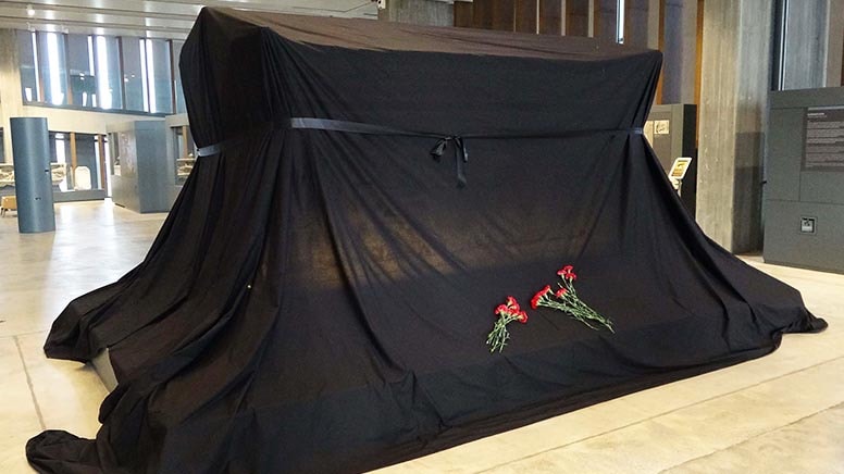 25 Kasım nedeniyle üzeri siyah örtüyle kapatılan lahde müzenin kadın çalışanları, karanfil bıraktı.