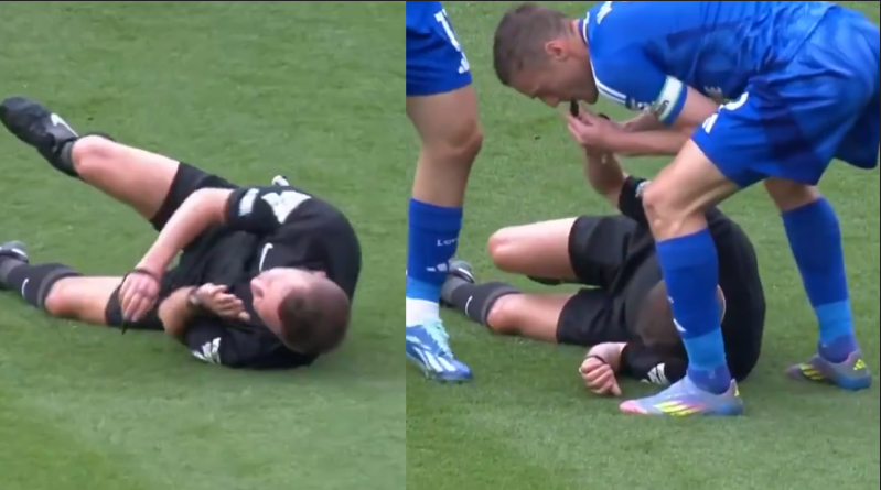 Jamie Vardy, yere düşen hakem David Webb'in düdüğünü çalıyor!#PL #beINSPORTS pic.twitter.com/0xKTJRt5MV
