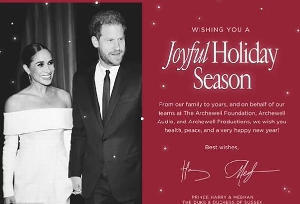 "Size keyifli bir tatil sezonu diliyoruz. Ailemizden sizinkine ve The Archewell Foundation, Archwell Audio ve The Archewell Productions ekiplerimiz adına sağlık, barış ve çok mutlu bir yeni yıl diliyoruz. En iyi dileklerimizle, Prens Harry ve Meghan." ifadesi yer aldı.