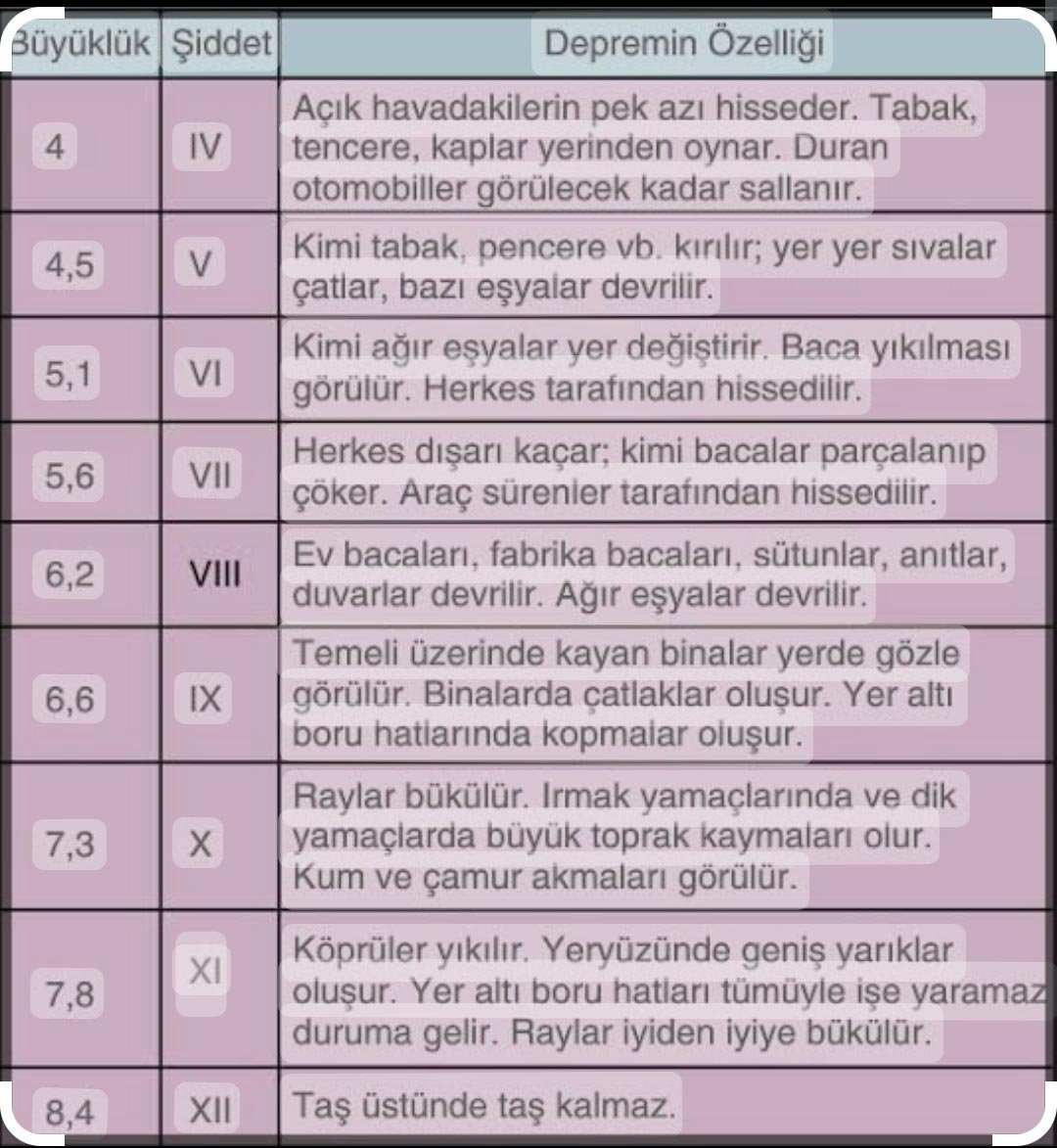 "Depremin iki ölçeği vardır. Büyüklük ve şiddet. Büyüklük deprem sırasında ortaya çıkan enerjinin büyüklüğünü belirtir. Bugüne kadar en büyük deprem 1960 yılındaki Şili depremi. Bu deprem 9.5 büyüklüğündeydi. Bir depremin şiddeti ise depremin insan kaynaklı yapılarla doğal yapılar üzerindeki hasar derecesini anlatır. Roma rakamlarıyla yazılır ve I-XII (1- 12) arasında değişen değerlerle ifade edilir.