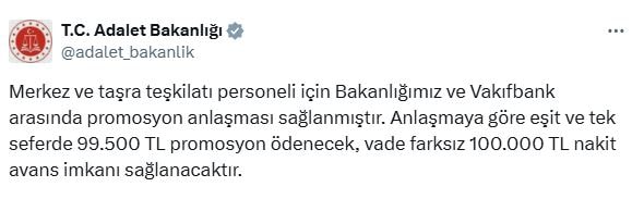 Yeni yıl öncesinde Adalet Bakanlığı çalışanlarına maaş promosyonunda önemli değişiklik yapıldı. Bakanlık ile Vakıfbank arasında imzalanan anlaşma kapsamında, personele tek seferde 99 bin 500 TL promosyon ödemesi yapılacak.