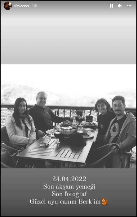 Simla Ener Instagram hesabından yaptığı paylaşımla Beta'nın ölmeden önceki son fotoğrafını paylaştı. Ener, paylaşıma "24.04.2022 Son akşam yemeği. Son fotoğraf. Güzel uyu canım Berk'im" notunu düştü.