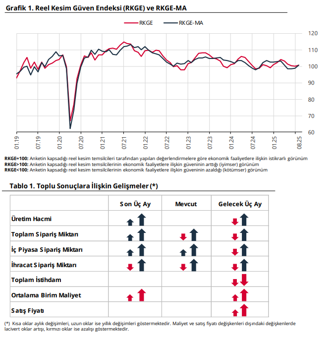 2025 yılı Ağustos ayında mevsimsellikten arındırılmış Reel Kesim Güven Endeksi (RKGE-MA), bir önceki aya göre 1,7 puan artarak 100,6 seviyesinde gerçekleşti.