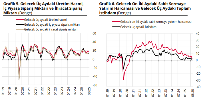 Gelecek üç aya yönelik değerlendirmelerde, üretim hacmi, ihracat sipariş miktarı ve iç piyasa sipariş miktarında artış bekleyenler lehine olan seyrin bir önceki aya göre zayıfladığı görüldü. Gelecek on iki aydaki sabit sermaye yatırım harcaması ve gelecek üç aydaki istihdama ilişkin artış yönlü beklentilerin de bir önceki aya göre zayıfladığı gözlemlendi.