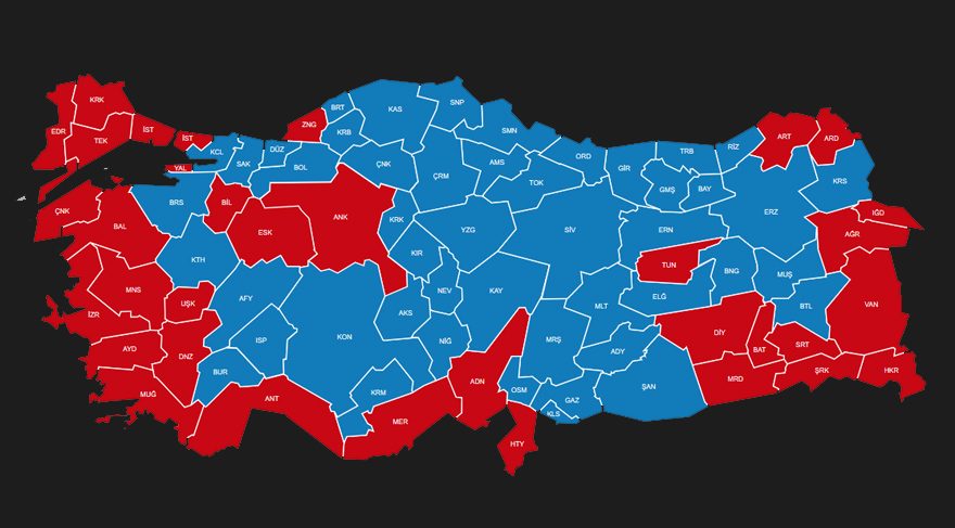 İSTANBUL VE ANKARA'YLA BİRLİKTE 33 İLDevlet eliyle yapılan evet kampanyasına rağmen 81 ilden 33'ü yönetim sistemi değişikliğine 'hayır' dedi. Alışılagelmiş sahil şeridinin yanı sıra İstanbul ve Ankara ile Bilecik, Zonguldak gibi kentlerden de 'hayır' çıktı.