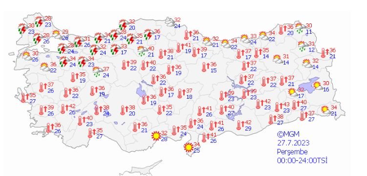Meteoroloji 2. Bölge Müdürlüğü verilerine göre Ege Bölgesi genelinde hava sıcaklıkları saat 15.10 itibarıyla Aydın'da 43,5, İzmir'de 43,2, Manisa'da 41,6, Denizli'de 40,4 santigrat derece olarak ölçüldü.