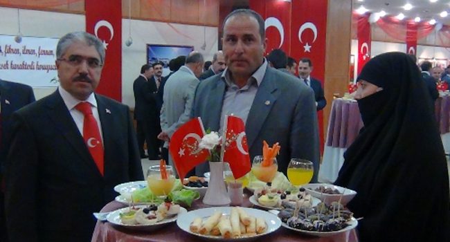 Muş'ta düzenlenen Cumhuriyet Bayramı resepsiyonuna çarşaflı eşi ile katılan köy muhtarı Hüseyin Sevinç, Vali Ali Çınar ile birlikte fotoğraf çektirerek kameralara poz verdi.