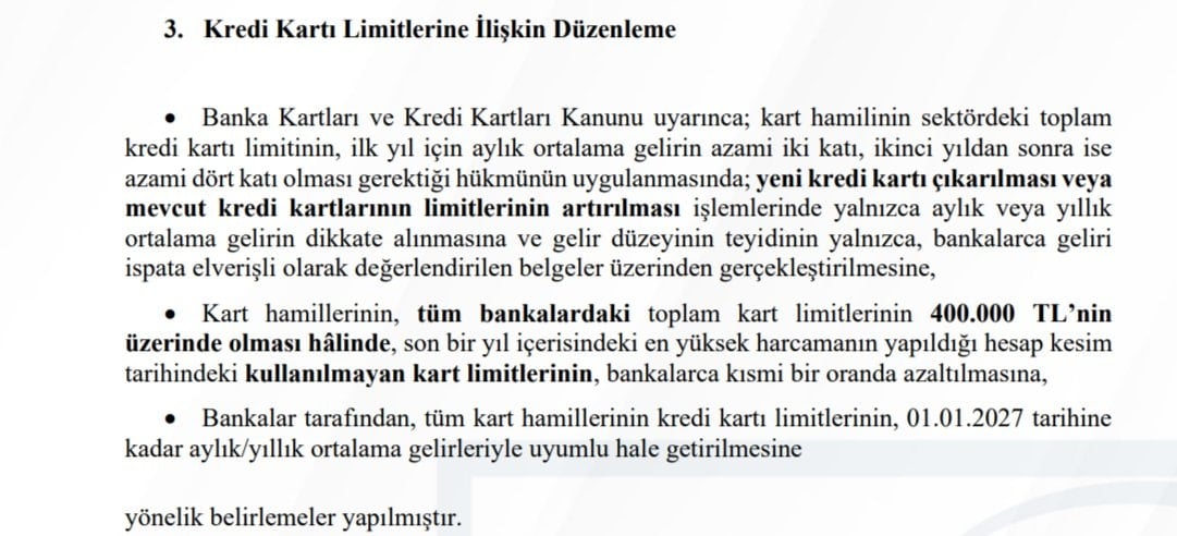 "Kart hamillerinin, tüm bankalardaki toplam kart limitlerinin 400.000 TL’nin üzerinde olması hâlinde, son bir yıl içerisindeki en yüksek harcamanın yapıldığı hesap kesim tarihindeki kullanılmayan kart limitlerinin, bankalarca kısmi bir oranda azaltılmasına karar verilmiştir."