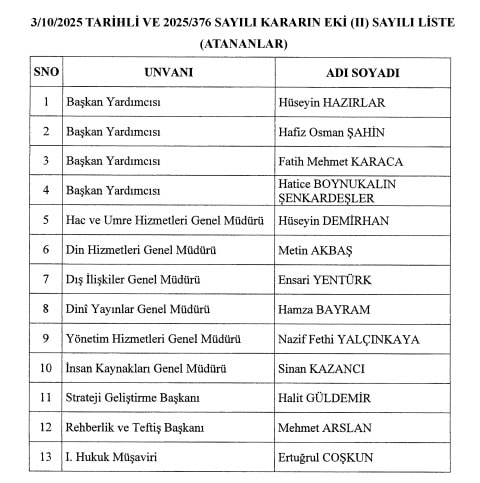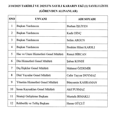 Diyanet İşleri Başkanlığı'nda Ali Erbaş döneminden kalan 4 başkan yardımcısı ve 8 genel müdür görevden alındı, yerlerine Hüseyin Hazırlar, Hafız Osman Şahin, Fatih Mehmet Karaca ve Hatice Boynukalın Şenkardeşler başkan yardımcısı olarak atandı deriz. Ayrıca Hüseyin Demirhan, Metin Akbaş, Ensari Yentürk, Hamza Bayram, Nafiz Fethi Yalçınkaya, Sinan Kazancı, Halit Güldemir, Mehmet Arslan, Ertuğrul Coşkun yeni genel müdürler olarak göreve getirildi.