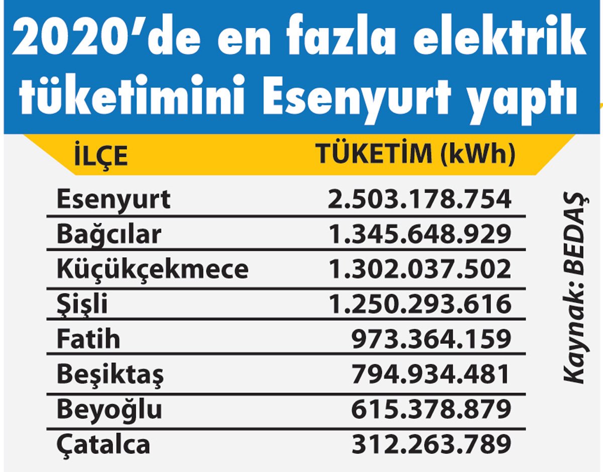 BEDAŞ’ın verilerine göre, Avrupa Yakası’nda 484 bini aşkın abonesi ile ilk sırada yer alan Esenyurt, tüketimde de yine birinci oldu. 2020 yılında Esenyurt’ta toplam elektrik tüketimi 2 milyar 503 kilovatsaat (kWh) seviyesinde gerçekleşirken, Avrupa Yakası’ndaki elektrik tüketiminin yüzde 10’u bu bölgeden geldi. Yıl içinde en düşük tüketim de Çatalca, Esenler ve Güngören’de yaşandı.