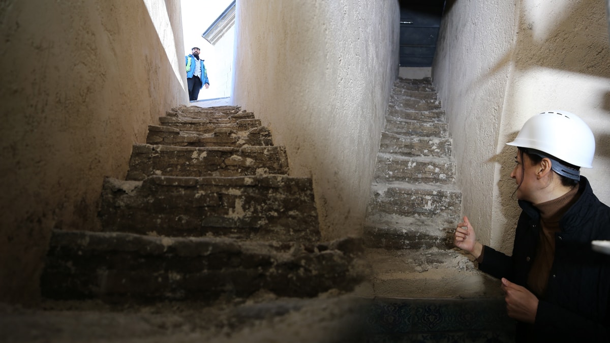 "Sıva raspası sonrasında caminin doğu ve batı taraflarında tonozun üst kısmında özgün dokuyla uyumsuz bir duvar örgüsü tespit ettik. Duvarın özgün dokuya uymayan tuğla örgüsünden o bölümün daha sonra kapatıldığını anladık. Bu bölümü özenle söktürdük ve tuğladan yapılmış, çatıya çıkan biri 11, diğeri ise 13 basamaklı iki merdivenle karşılaştık. Merdivenler tuğladan inşa edilmiş.