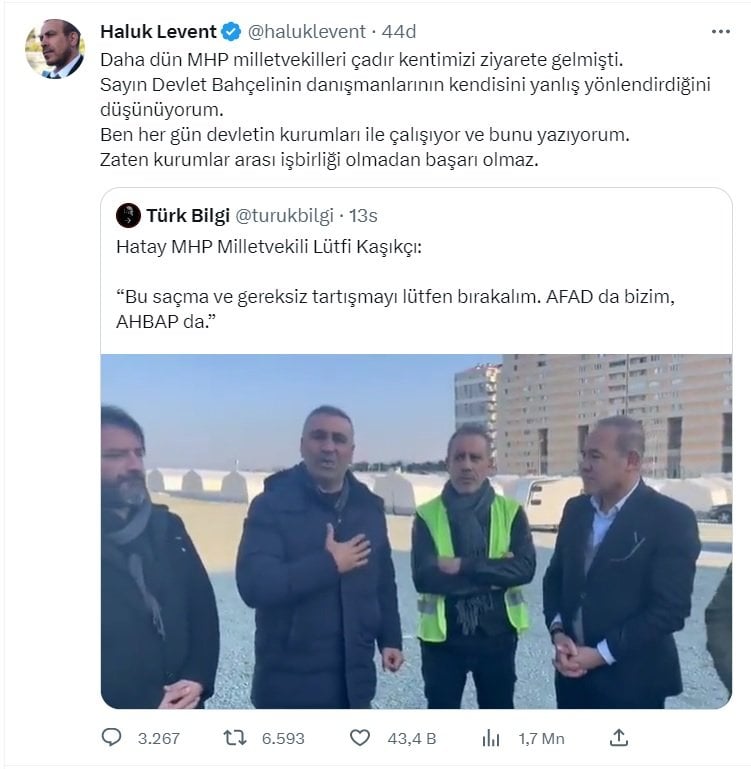 Haluk Levent, yaşanan gerilim sonrasında sosyal medyadan bir paylaşımda bulunmuştu.Analizde, "Yaşanan felaket sonrası Türkiye'den ve dünyadan depremzedelere bağış yapanların bir kısmı, devlet destekli AFAD ve Kızılay'a yardımda bulunurken, Ahbap gibi sivil toplum örgütlerinin de büyük miktarlarda bağış toplaması son dönemde dikkatleri derneğin üzerine çekti. Öyle ki yaptığı deprem paylaşımında pop yıldızı Madonna da bağış için Ahbap'ı adres gösterdi" yorumu yapıldı.