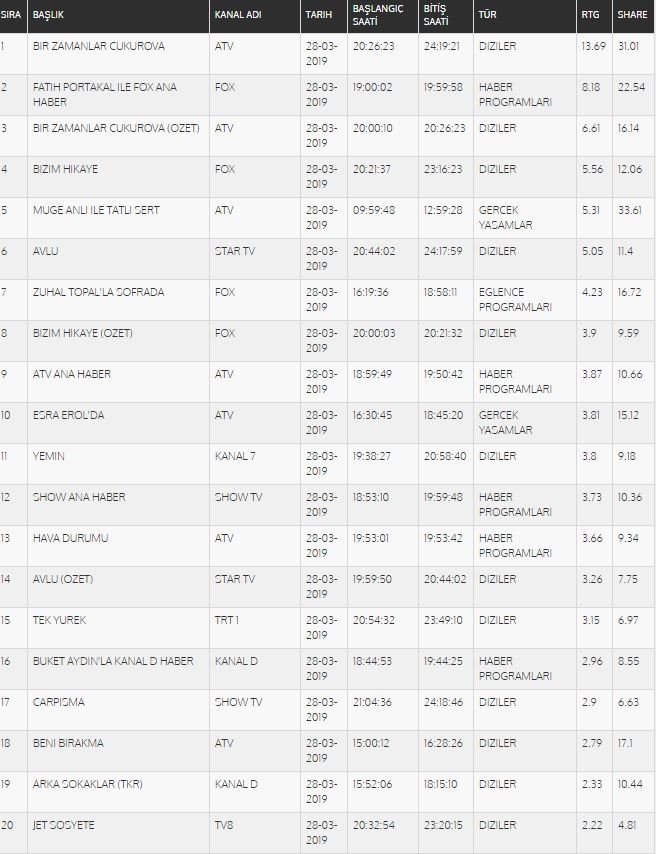 Reyting sonuçlarına göre Bir Zamanlar Çukurova birinci oldu, Fatih Portakal ile Fox Ana Haber ikinci sırada yer aldı. Fox TV’nin sevilen dizisi Bizim Hikaye reyting sıralamasında dördüncü olurken, Avlu altıncı oldu. Show TV’de yayınlanan Çarpışma ise on yedinci sırada yer aldı. İşte total reyting sonuçlarına göre ilk 20 sıra…