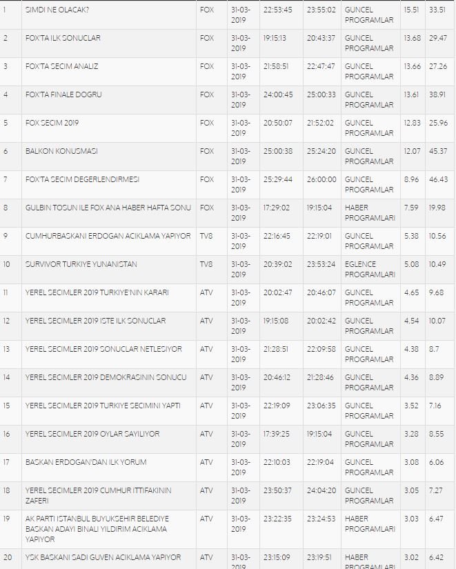 31 Mart reyting sonuçlarına göre, FOX TV'nin seçim programları rakiplerine fark attı. Total reytinglerde ilk 8 sıra FOX'un oldu. İşte total reytinglerde ilk YİRMİ sıra...