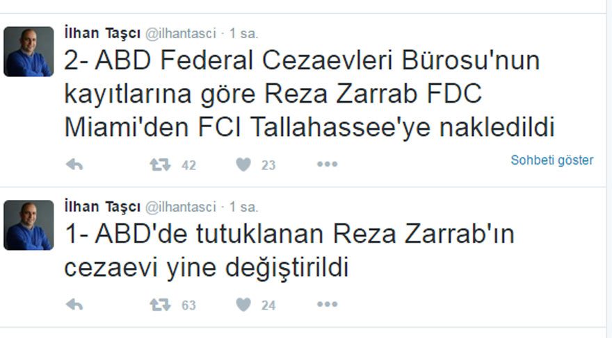 Yapılan açıklamada, " ABD Federal Cezaevleri Bürosu'nun kayıtlarına göre Reza Zarrab FDC Miami'den FCI Tallahassee'ye nakledildi. Reza Zarrab'ın Tallahassee'ye nakledildiginin kaydı. Reza Zarrab'ın Tallahassee'ye nakledildiginin kaydı. Reza Zarrab'ın Tallahassee'de nakledildigi cezaevi. Reza Zarrab'ın nakledildigi cezaeviyle ilgili ilginç bir bilgi kayıtlara göre burası kadın cezaevi gibi görünüyor. Reza Zarrab'ın nakledildigi cezaevi ve genel ABD mahkum arama sistemine şu adresten bakabilirsiniz" denildi.