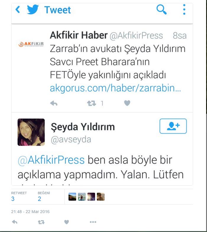 Yandaş medyada Rıza Zarrab'ı tutuklayan savcının FETÖ'cü olduğunu yazdı. Zarrab'ın avukatı ise bu iddiaları sosyal medya üzerinden yalanladı.