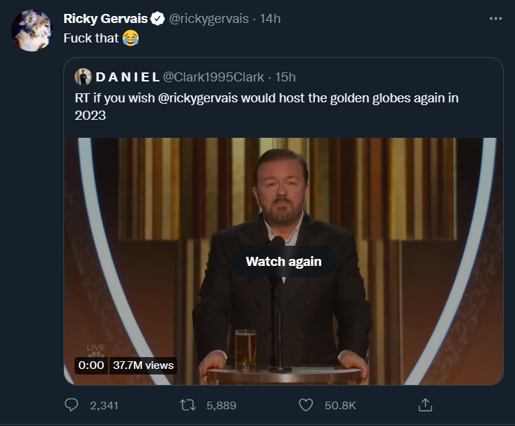 Gervais'in bu çarpıcı sözleri, salondaki çoğu izleyici tarafından hoş karşılanmasa da televizyon başındaki izleyiciler tarafından takdir edilmişti. Şimdi ünlü komedyenin, Twitter'da yeniden ödül törenine ev sahipliği yapıp yapmayacağı gündeme geldi. Bir hayranının sunucu olmasını istediğini yazdığı tweet'i paylaşarak küfür edip gülen emoji koyan Gervais, sunuculuk yapmayacağını da belirtmiş oldu.