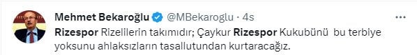 CHP İstanbul Milletvekili Mehmet Bekaroğlu ise sosyal medya hesabından, “Rizespor Rizelilerin takımıdır; Çaykur Rizespor Kulübü'nü bu terbiye yoksunu ahlaksızların tasallutundan kurtaracağız” ifadelerini paylaştı.