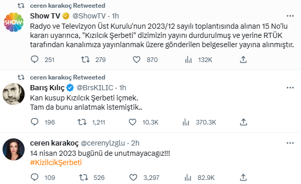 Radyo ve Televizyon Üst Kurulu (RTÜK), Show TV’de yayınlanan ‘Kızılcık Şerbeti’ dizisinin yayınını 6112 sayılı Kanun'un 8'inci maddesindeki "Toplumsal cinsiyet eşitliğine ters düşen, kadınlara yönelik baskıları teşvik eden ve kadını istismar eden programlar içeremez" ilkenin ihlali nedeniyle bu akşam durdurdu. Show TV’nin resmi Twitter hesabından yayınlanan açıklamasında, “Radyo ve Televizyon Üst Kurulu'nun 2023/12 sayılı toplantısında alınan 15 No'lu kararı uyarınca, ‘Kızılcık Şerbeti’ dizimizin yayını durdurulmuş ve yerine RTÜK tarafından kanalımıza yayınlanmak üzere gönderilen belgeseller yayına alınmıştır” denildi.