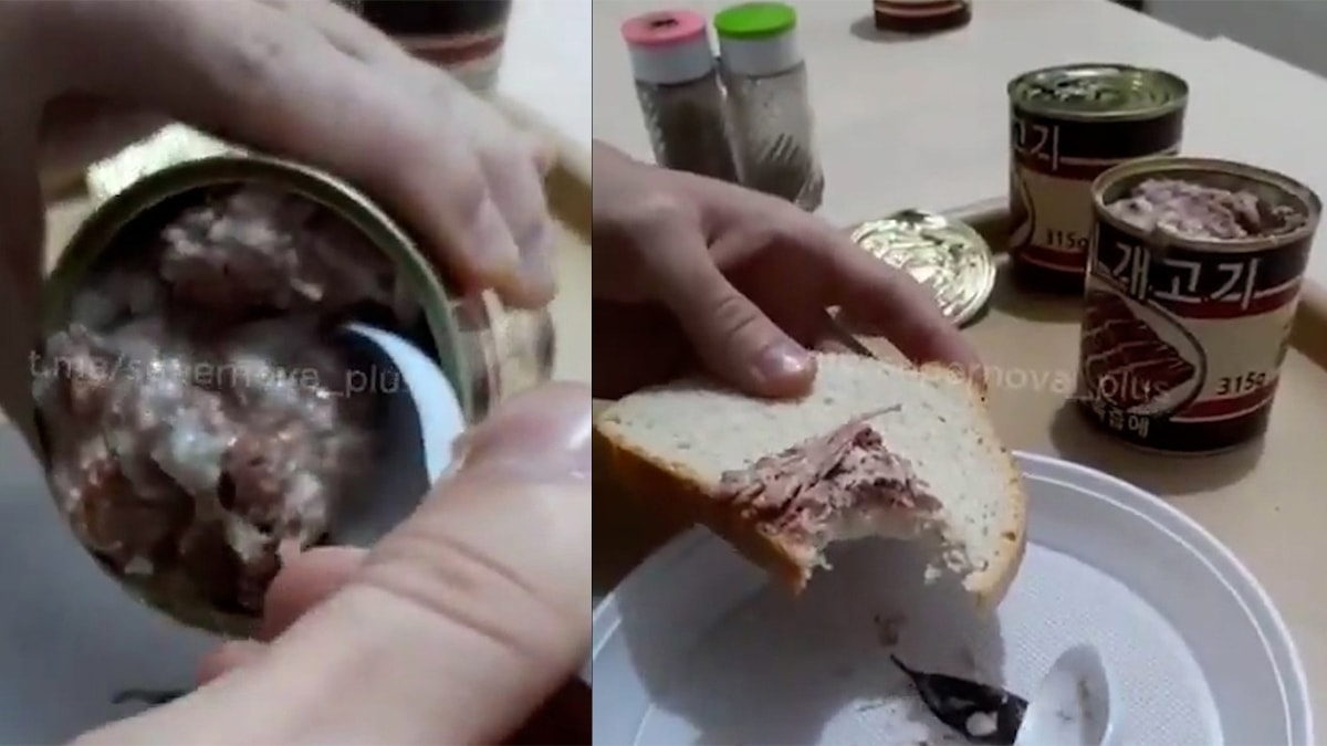 Sosyal medyada paylaşılan bir videodaki Rus askeri, 'kardeş ülke' sayesinde elde ettiği erzakın tadına kamera karşısında baktı. Sonradan kutunun üzerindeki Korece yazıları çeviren Rus askerleri, konserve kutudan çıkanın köpek eti olduğunu öğrendi.